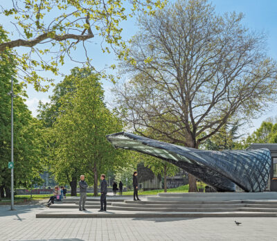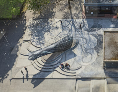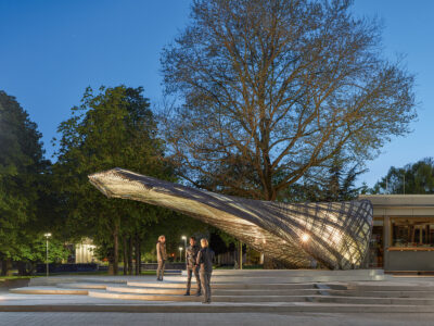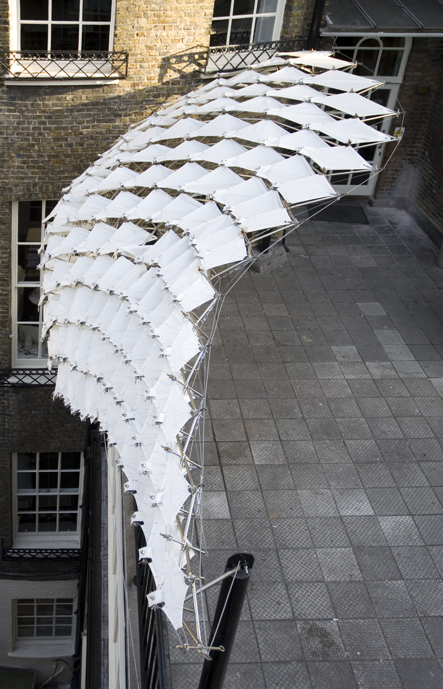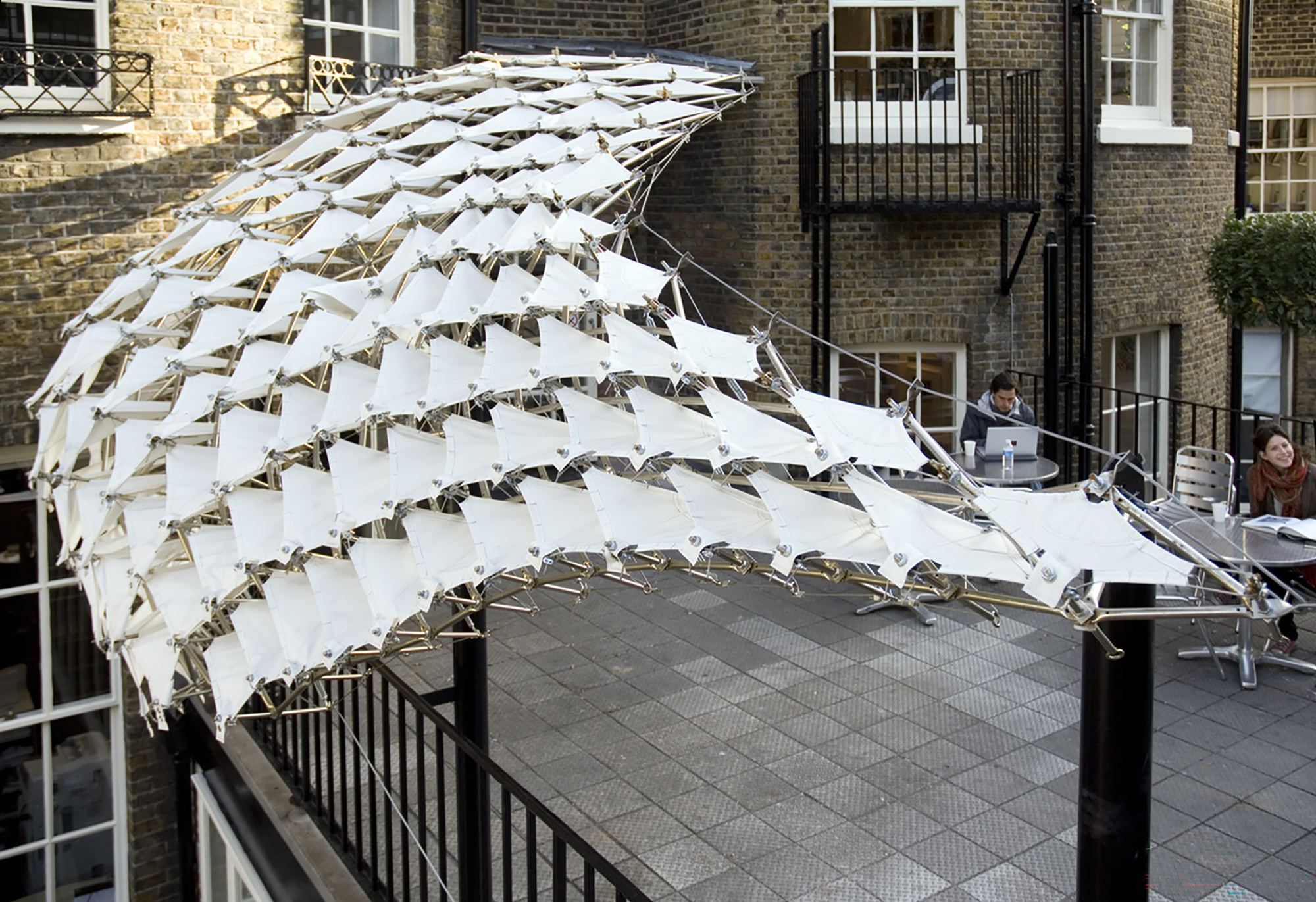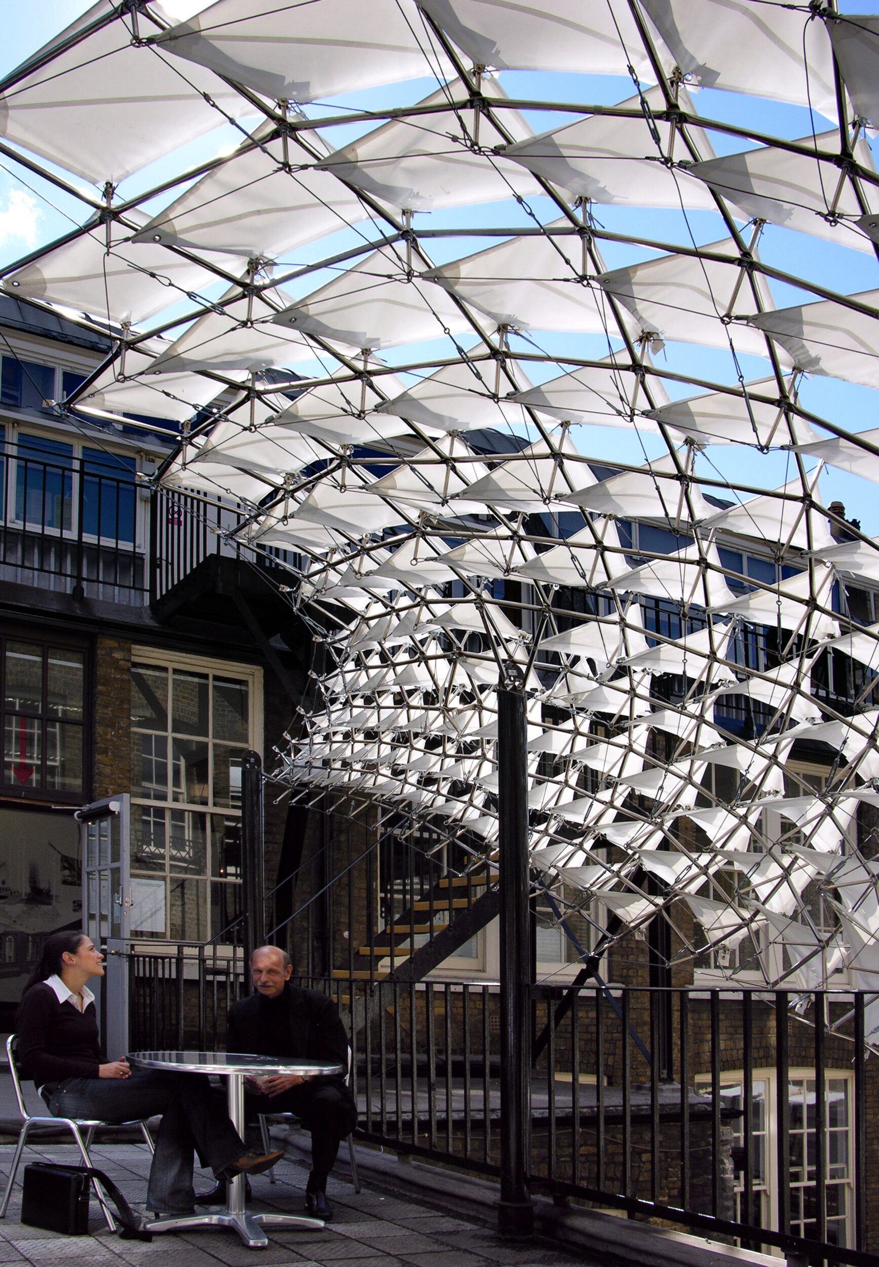 Die Entwicklung der entsprechenden Komponenten basiert hauptsächlich auf dem Abgleich von drei kritischen Kriterien. Das statische Verhalten wurde mit den Ingenieuren von Buro Happold so entwickelt, dass die vorgespannten Membranelemente zu einem integralen, tragenden Teil des Systems werden und nicht nur eine Verkleidung auf einer Spaceframe-Struktur darstellen. Ein weiterer wichtiger Faktor ist das Beschattungsverhalten des Vordachs zu verschiedenen Jahres- und Tageszeiten sowie die Ableitung des Regenwassers über die poröse Oberflächengliederung, die ebenfalls digital simuliert und getestet wurde. Auf diese Weise wird das parametrische Modell zur Schnittstelle für eine Entwurfsentwicklung, die zu einer übergeordneten performativen Integration führt, während es gleichzeitig alle relevanten Daten für die Herstellung und den Zusammenbau der aus 600 geometrisch unterschiedlichen Teilen und 150 verschiedenen Membranelementen bestehenden Stahlstruktur ableitet. Die sich daraus ergebende überlappende Membranartikulation schützt die Terrasse vor Regen und bleibt gleichzeitig porös genug, um übermäßigen Winddruck zu vermeiden oder den Blick auf die Londoner Dachlandschaft zu versperren. Außerdem tragen die Membranen erheblich zur Steifigkeit der Gesamtkonstruktion bei.