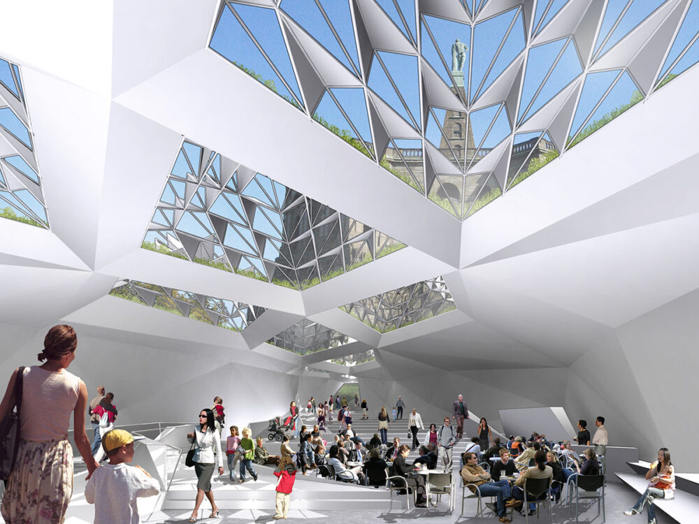 Der Wettbewerbbeitrag für die neue tschechische Nationalbibliothek in Prag, ein Gemeinschaftsprojekt von OCEAN NORTH und Scheffler + Partner, zielt darauf ab, einem der wichtigsten Gebäude der tschechischen Kultur ein einzigartiges, monolithisches Erscheinungsbild zu verleihen und gleichzeitig eine kontinuierliche und abgestufte Raumerfahrung des Gebäudes und der angrenzenden Landschaft zu ermöglichen. Das Gesamtvolumen des Bauwerks ist so strukturiert, dass es gleichzeitig geschlossen und offen, begrenzt und durchgängig ist, so dass Besuchende und Mitarbeitende unterschiedliche Raumerfahrungen machen können. Das Projekt versteht sich als eines von mehreren landschaftlich gestalteten Arealen, die zusammen ein Netzwerk von benachbarten Veranstaltungen, differenzierten Raumangeboten und landschaftlichen Orten bilden.