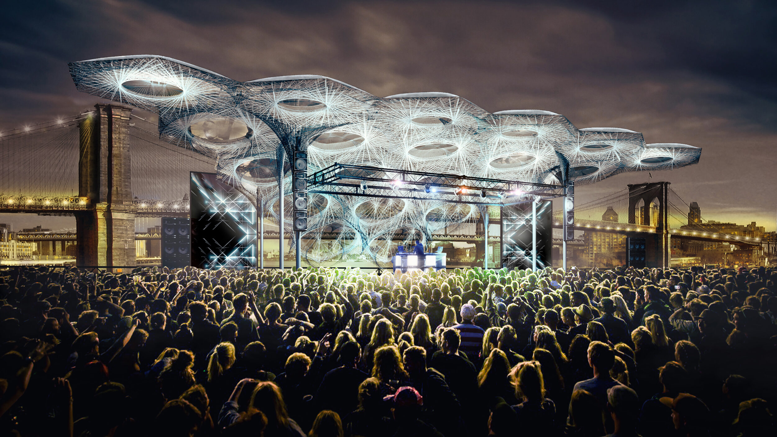 Der Stage Envelope auf dem Dach des Pier 17 verbindet die Eigenschaften eines außergewöhnlichen Ortes in Manhattan mit einer außergewöhnlichen Architektur. Das konstituierende Merkmal des Projekts ist eine neuartige Faserverbunddachstruktur. Dieses neuartige Bausystem, das vollständig aus Kohlenstoff- und Glasfasern in einem vollständig digitalen Fertigungsprozess hergestellt wird, ist sowohl architektonisch ausdrucksstark als auch strukturell effizient. Es intensiviert das Erlebnis der Besucher , indem es eine unverwechselbare Veranstaltungskulisse und einen einzigarten Ort vor einer weltbekannten Aussicht darstellt. So entsteht ein neues architektonisches Wahrzeichen an einer der prominentesten Stellen von New York City.